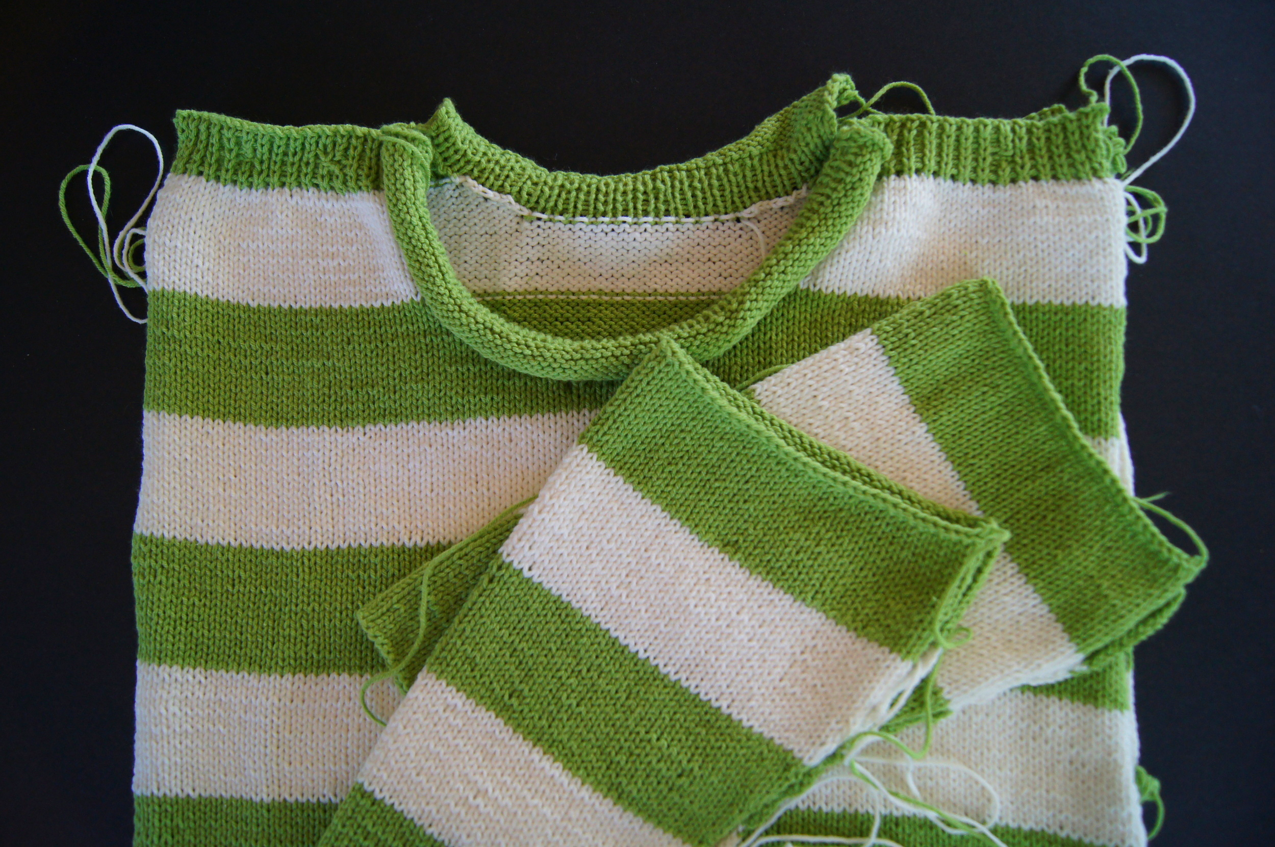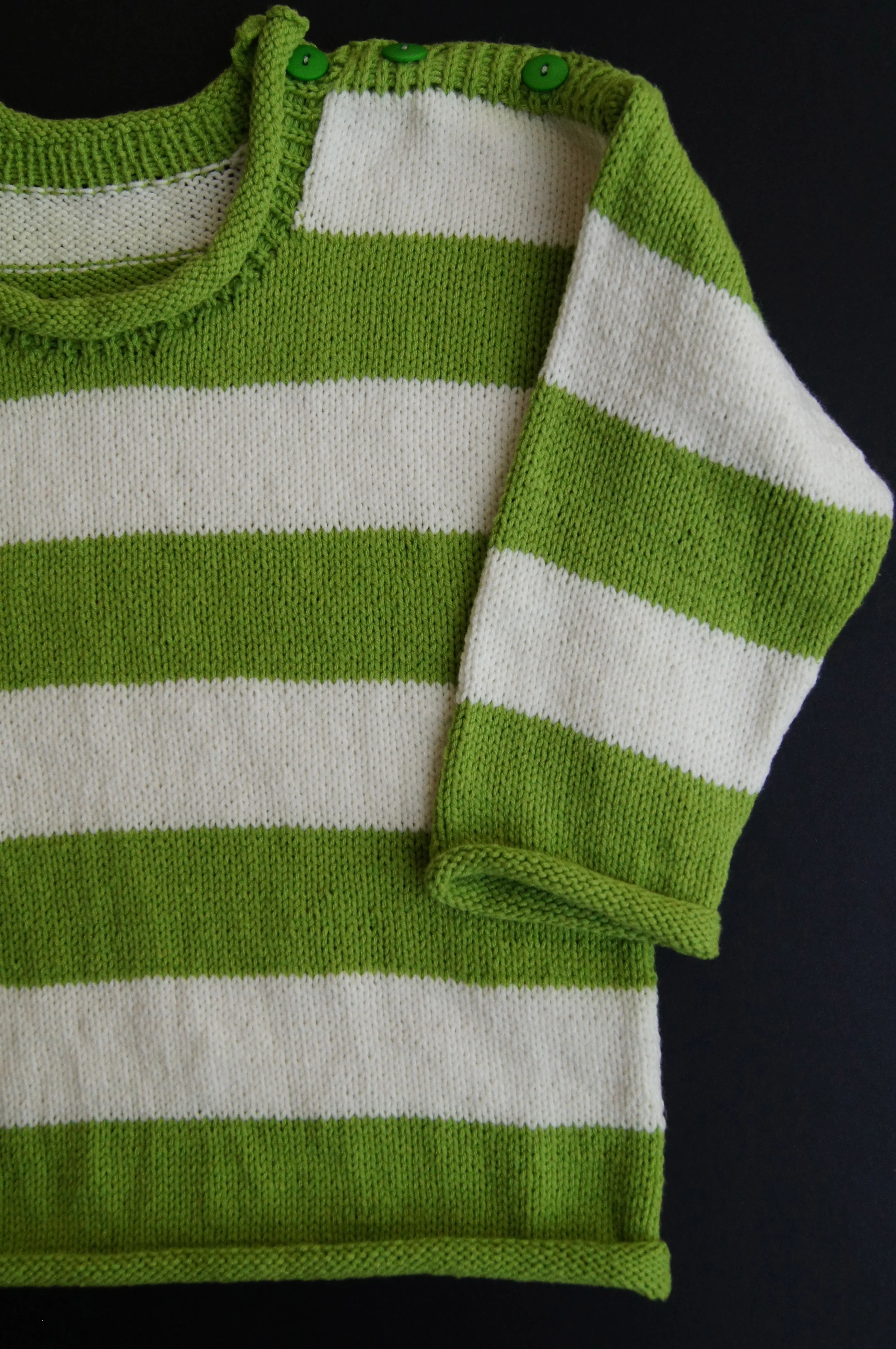 The traditional rib band is exchanged with a roll band knitted on a needle 0.50 mm smaller than the body and sleeves to make it roll.