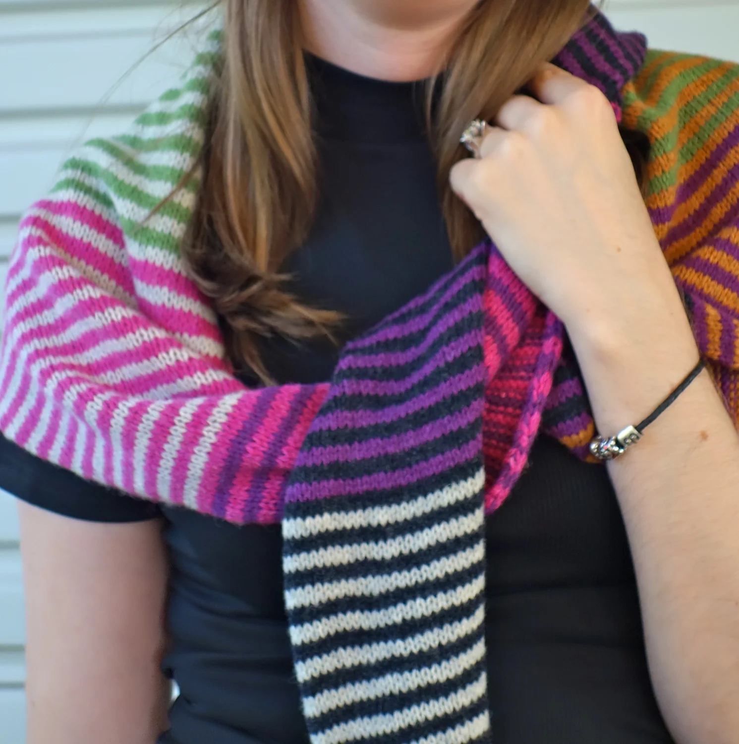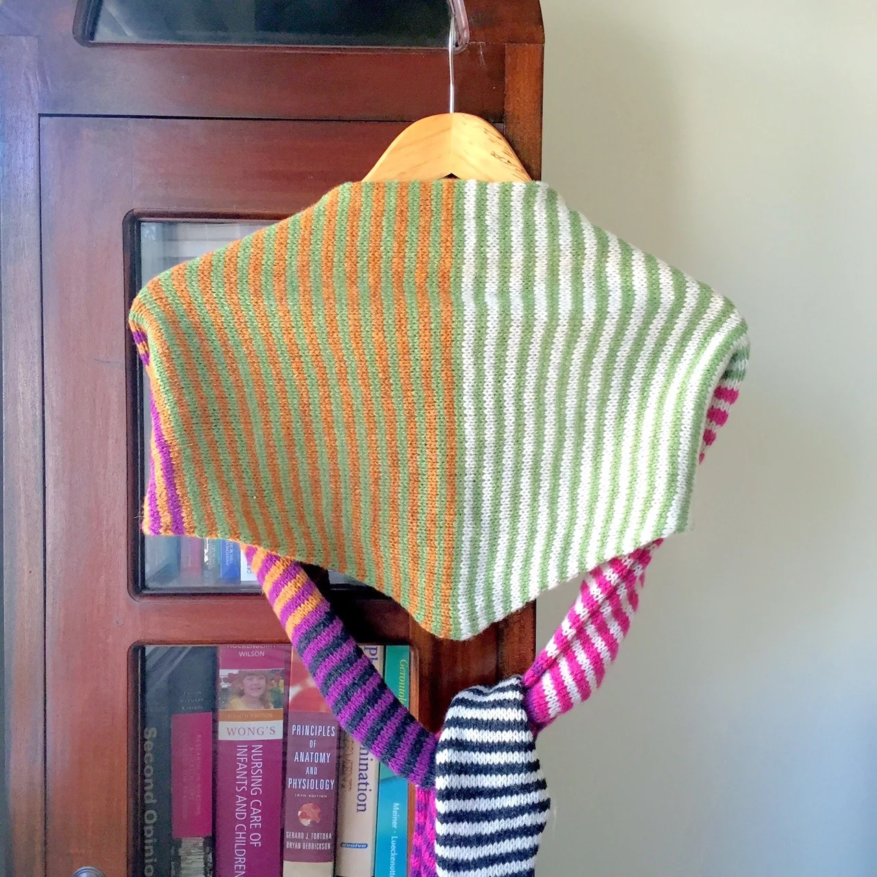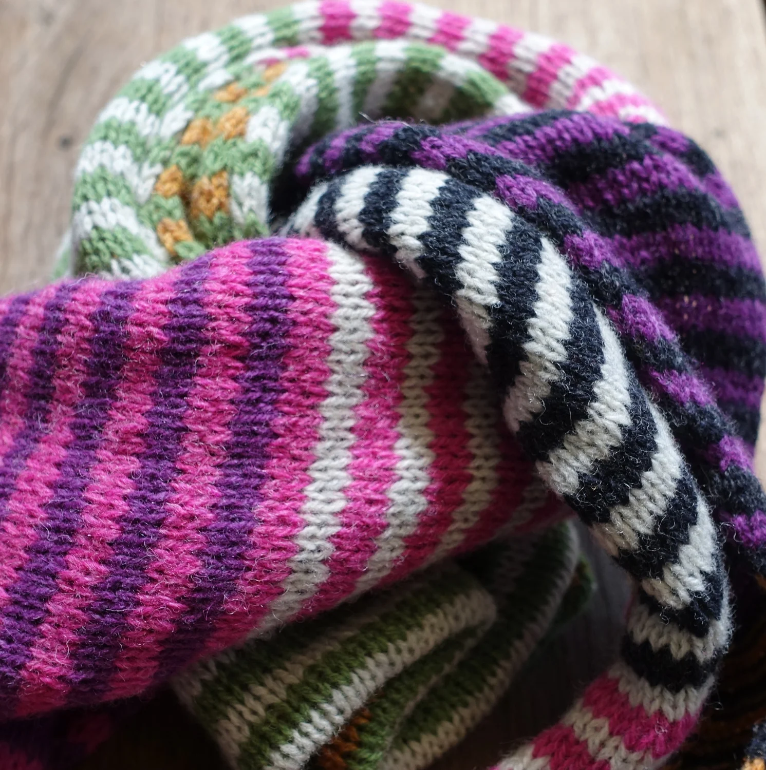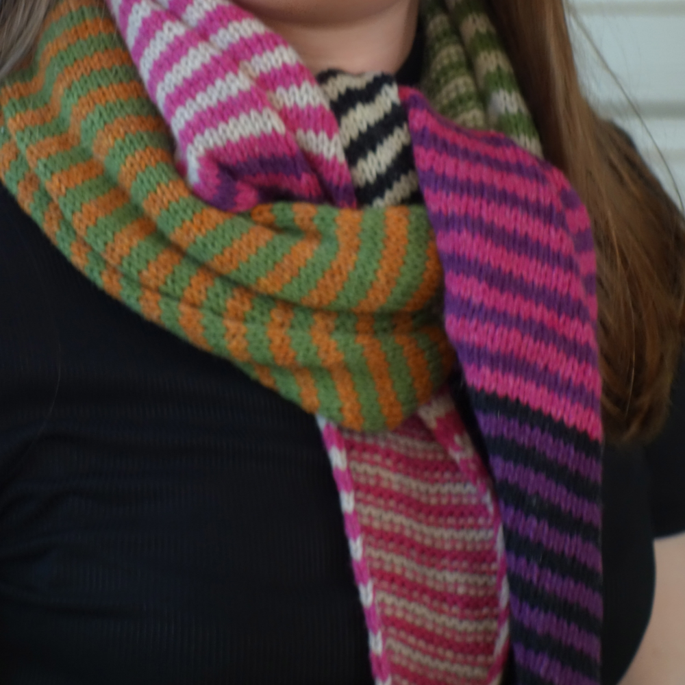 I used six balls of Lambswool, 25 grams each. A circular needle size 4.5 mm. Tension 22 stitches in double yarn measures 10 cm. Cast on 4 stitches and knit 14 rows with colour 1. Add colour 2 and continue in stripes, adding one stitch at the end of every 4th row. Continue increasing the stitches till all six colours have been used, this will be the middle of the work. Then reduce the stitches with 1 stitch every 4th row till 4 stitches remains. Knit 14 rows. Cast off. The finished scarf measures 256 cm long and 38 cm at the widest part