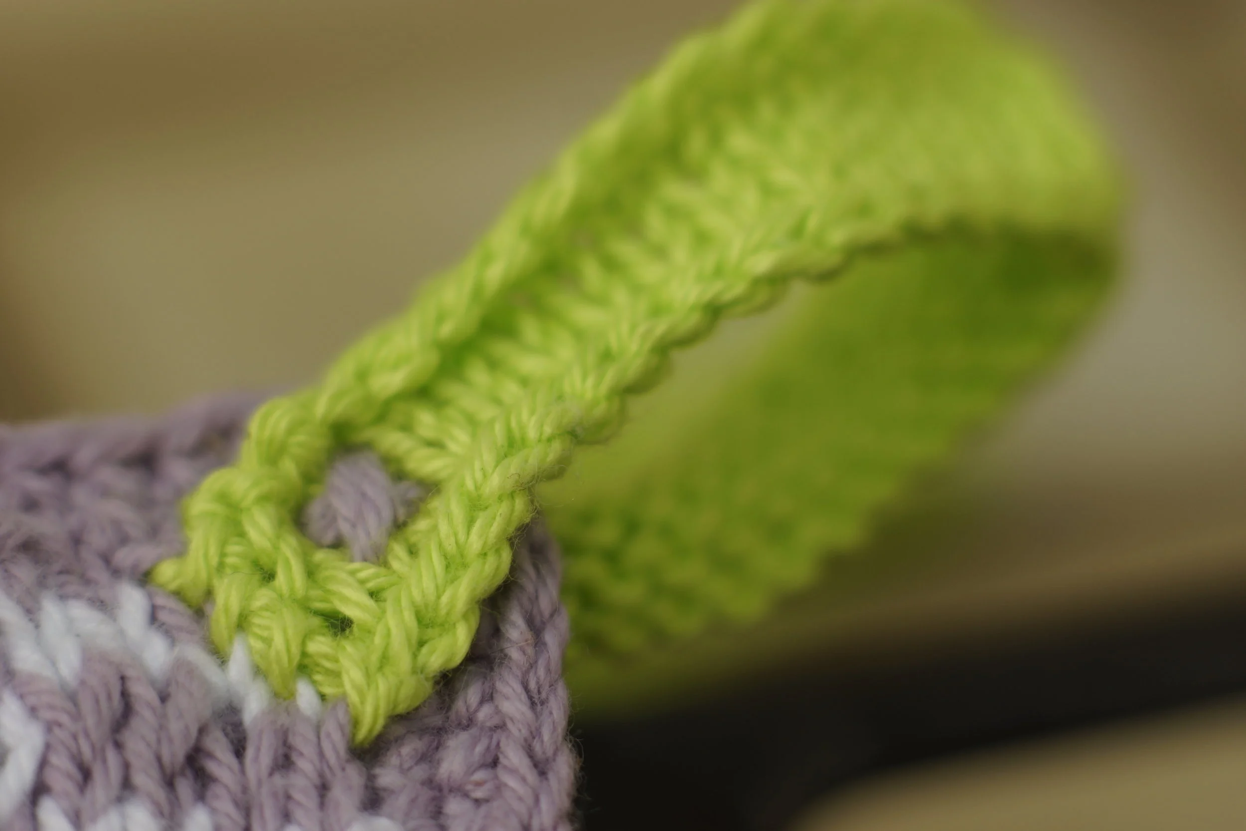 Handle: With lime colour CO 30 sts onto 2.50mm needles. Knit 4 rows, k on the RS, p on the WS. BO.