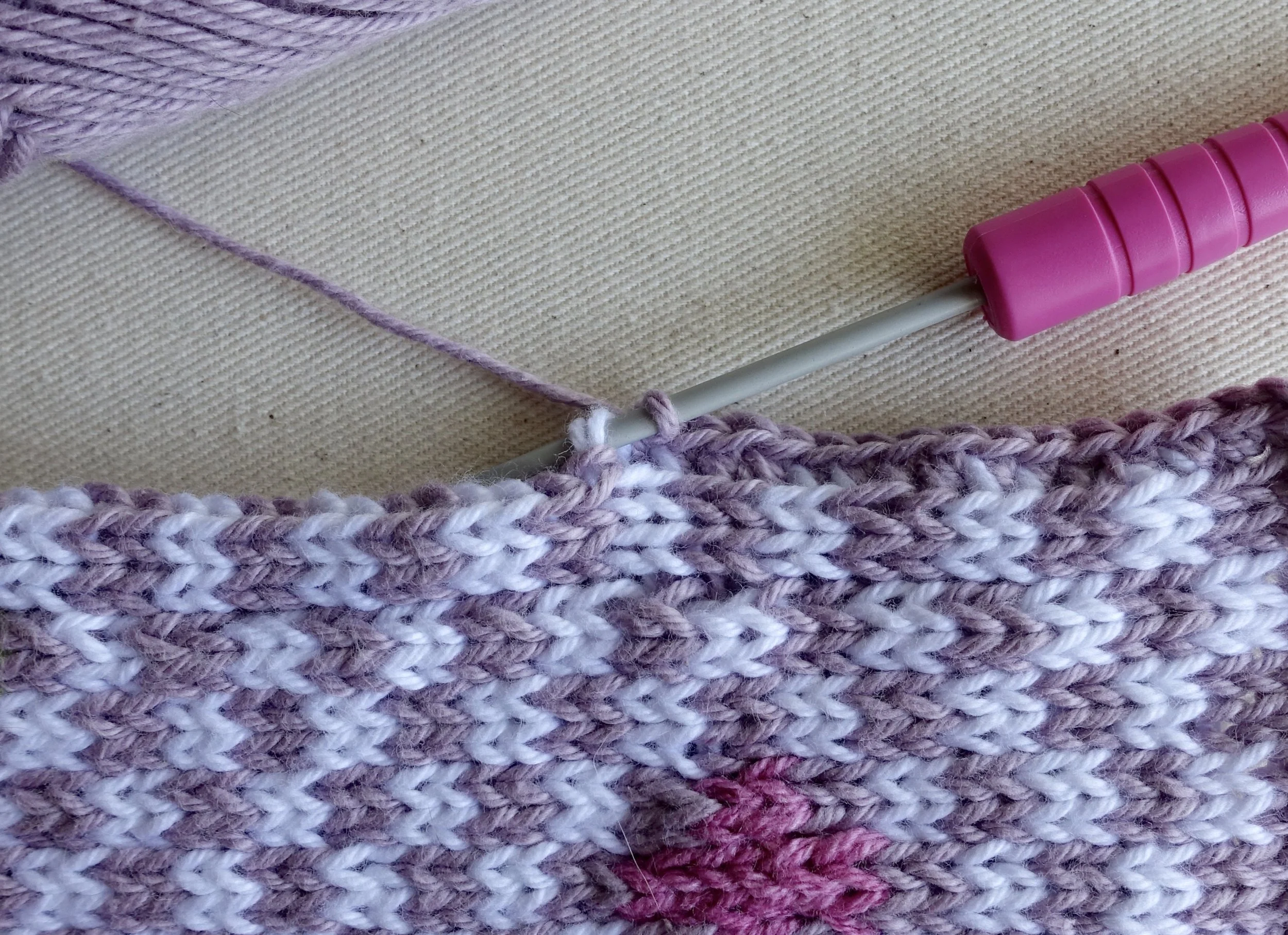 Turn right side out and use your crochet hook and lilac yarn to double crochet the whole way around the front side this way: Starting at the left side down dc 2 sts in the corner sts then cont. with dc in each edge stitch; dc 2 sts in the corner st; cont. dc along the bottom edge but skip every 4th sts; dc 2 sts in the corner st; cont. dc in each edge stitch up along the right side; dc 2 sts in the corner st; dc but skip every 4th sts along the top edge; end with a sl st in the first corner st. Rpt on the backside. Now crochet both sides together from the front side using dc. Attach the handle at the front right corner and onto the back’s left corner.